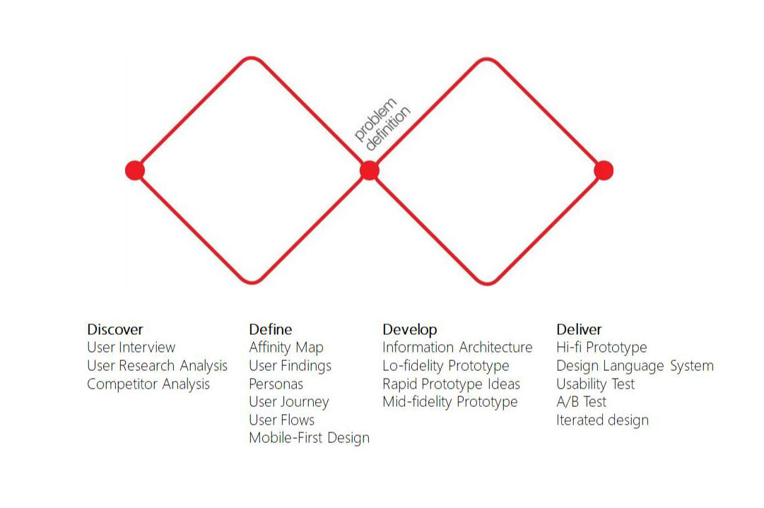 The double diamond diagram is used as the design process to explore the problem and solution space with keeping the users at the heart of the process. This means that ideas are developed, tested and refined a number of times, with weak ideas dropped in the process. Solutions or concepts are prototyped, tested and iterated. This process of trial and error helps designers to improve and refine their ideas until they are finalised, produced and launched.