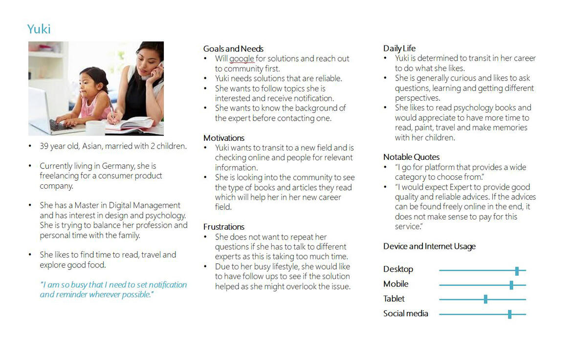 I created 3 personas based on the findings from the user research.These personas help to identify the user’s needs and goals, provide the answer for the question: “whom am I designing for?”